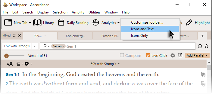 4. To open a favorite moduleClosed Any Bible text, or other single tool that can be read in Accordance, including reference texts and articles; may also be referred to as content or resource on the toolbar in a new workspace, click the toolbar item then press Control .