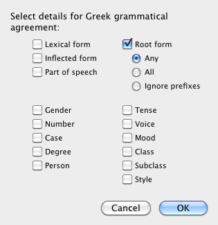 - Select (agreement with) Root form to specify whether Any or All roots must agree (for words with multiple roots).