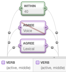 The positive AGREE item specifies that the elements must be from the same lexical formClosed The canonical (dictionary) form of a word. The negative AGREE item specifies that they cannot agree in voice. This construct finds places in which the text shifts from the activeClosed The application, window, tab, or other screen element which is currently being used; sometimes called the "front" or "frontmost" screen element to the middle voice (or vice versa) for the same verb.