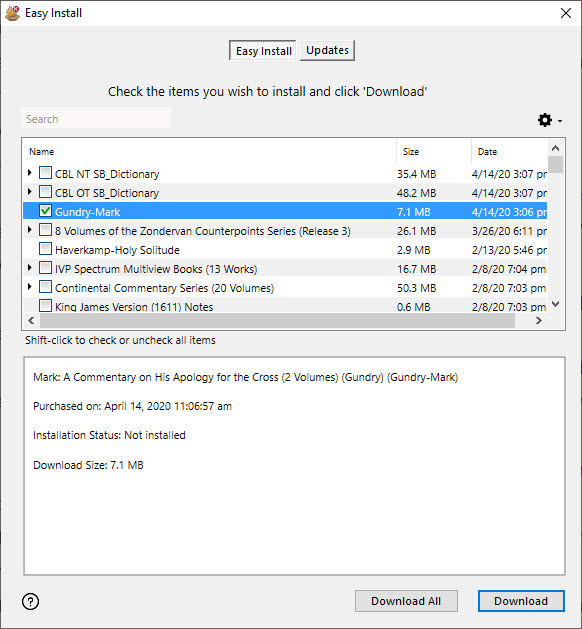 Any Bible text, or other single tool that can be read in Accordance, including reference texts and articles; may also be referred to as content or resource in a package. You can then select or deselect items in that package. - You can choose more than one item to download.