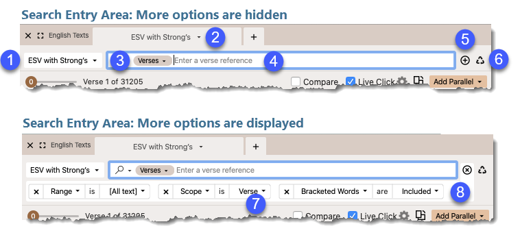 The Search Entry area is located at the top of each Search tabClosed The core tab used to search Bible texts, it consists of a search entry area and a search results area.