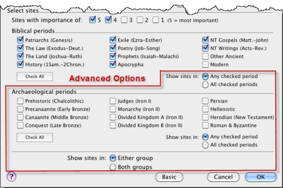 - Show sites in (Biblical periods and Archeological periods): For both periods, choose either Any checked period or All checked periods.