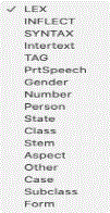 • Grammatically tagged texts offer more items, including LEX, INFLECT, and TAG items, and the appropriate classes of parsing information. Examples of the Class pop-up menus that may appear are shown below.