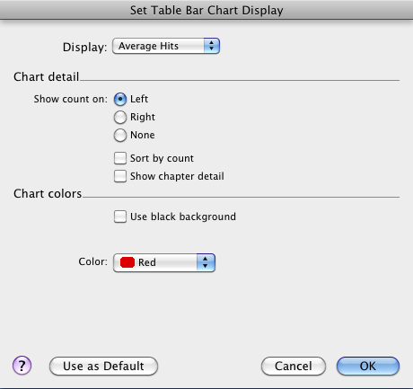 Display pop-up menu: Used to choose the default display for what is counted. Available options are: Average Hits, Total Hits, Total Words, and Total Verses.